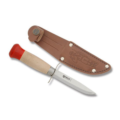 Speider means "Scout" and Gutt means "Boy" in Norwegian, and this is the standard Norwegian boy scout knife. It has a simple drop point blade of non-laminated stainless steel, and a stamped double cross guard. The blade is 3 1/2", as is the handle, so this one would be best suited to someone with a small hand. The sheaths are stamped with the image of a Boy Scout. Comes with a brown leather sheath.