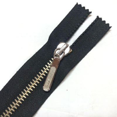 Single Premium Quality silver Lampo zipper on black backing. One-way. Closed at bottom, especially for use in pouches, bags, pockets, etc.