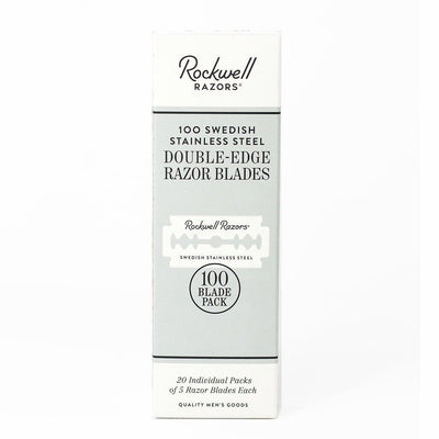 Rockwell Razors double-edged safety razors manufactured with Swedish stainless steel. Box of 100 blades, in individual packs of 5 razor blades each.
